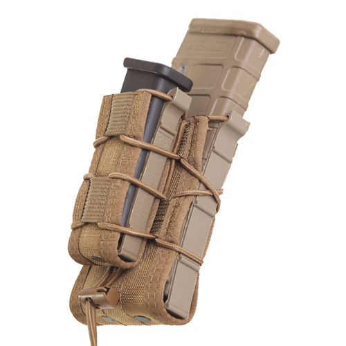 The Double Decker unit can also fit some radio models, flashbangs, smoke grenades, multitools and even flashlights, adding to its exceptional versatility. Both pouches are constructed from durable Cordura and injection-molded polymer. The pouches secure contents with a shock cord closure, ensuring a positive and adjustable grip.