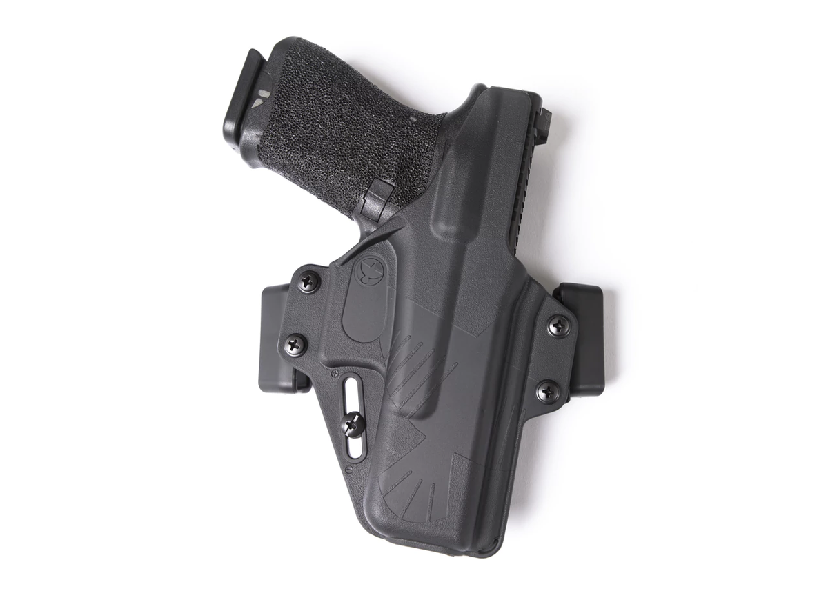 The Perun is the flagship outside-the-waistband (OWB) holster. It is the result of blending the best features of two of the most popular holsters, the Eidolon and the Phantom, to create a highly refined, exceptionally concealable holster. The Perun is designed to be the best modular OWB ''pancake'' style holster on the market. It has a body-hugging design that rides high for maximum concealment. The body of the holster is only slightly larger than the pistol contained in it. This small size aids in concealment while also making the holster more comfortable while seated in a vehicle. The body-hugging curvature of this holster is accomplished using modular belt loops. Each holster includes three pair of 1.5'' belt loops (LH 10 degree cant, RH 10 degree cant, and ambi 0 degree cant), which allow the end-user to configure the ambidextrous holster body for left-handed or right-handed use, with either a 0-degree or 10-degree cant. Retention in the Perun is crisp, defined, and consistent, thanks to innovative design features inside the holster body. The unique retention slider makes adjusting retention as simple as turning up the volume on your stereo. And unlike other holsters that use the traditional ''screw through a rubber grommet'' style of retention, the Perun's retention will not back off after repeated drawing and re-holstering.