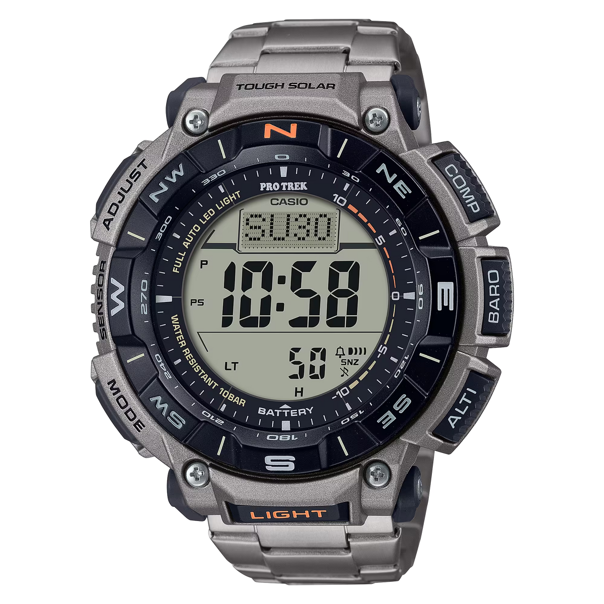 The Pro Trek line of authentic outdoor gear for nature lovers introduces the PRG340, a timepiece that incorporates environmentally friendly bio-based resin while delivering the same comfortable fit for your wrist. The case and urethane band are crafted from bio-based resin made with castor oil and the band from bio-based resin made with corn. The duplex LCD lays out separate layers for the compass graphics and the clock functions, enabling a larger compass display for better legibility and easier navigation in a design that is both functional and beautiful. The rotating bezel makes it simple to record compass readings, and the tough solar charging system keeps the advanced functionality on the go.