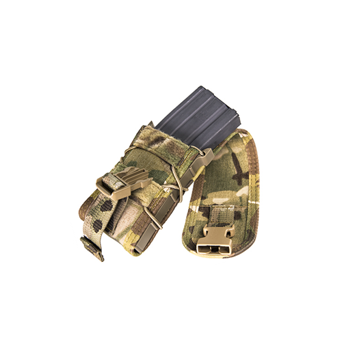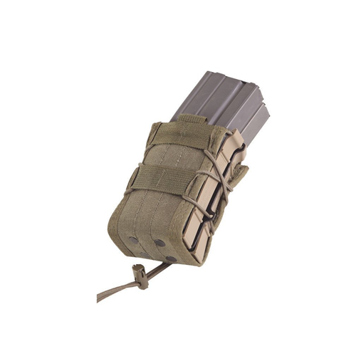High Speed Gear HSGI Covered Taco Mag Holder uses injection molded polymer sides, Cordura front and back, shock cord lacing and a buckled flap to lock just about any magazine into place and protect the contents.