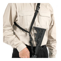 The Storm Single Point Sling QD from Blackhawk! is a convenient, versatile and adjustable weapon portability system. It is made from tough, 1.25-inch nylon webbing, complete with reinforced stitching for maximum strength. Its rugged tri-glide buckle adjusts the strap from 30 to 50-inches in diameter, allowing a proper fit tailored to any user and making it compatible with body armor and other bulky gear. It comes with a removable MASH clip that attaches easily to a firearm's sling point, complete with an elastic casing that makes it silent and stealthy to use. An additional side-release buckle allows the attachment or removal of the firearm while still wearing the sling. The strengthened buckle can withstand 300-pounds of load.