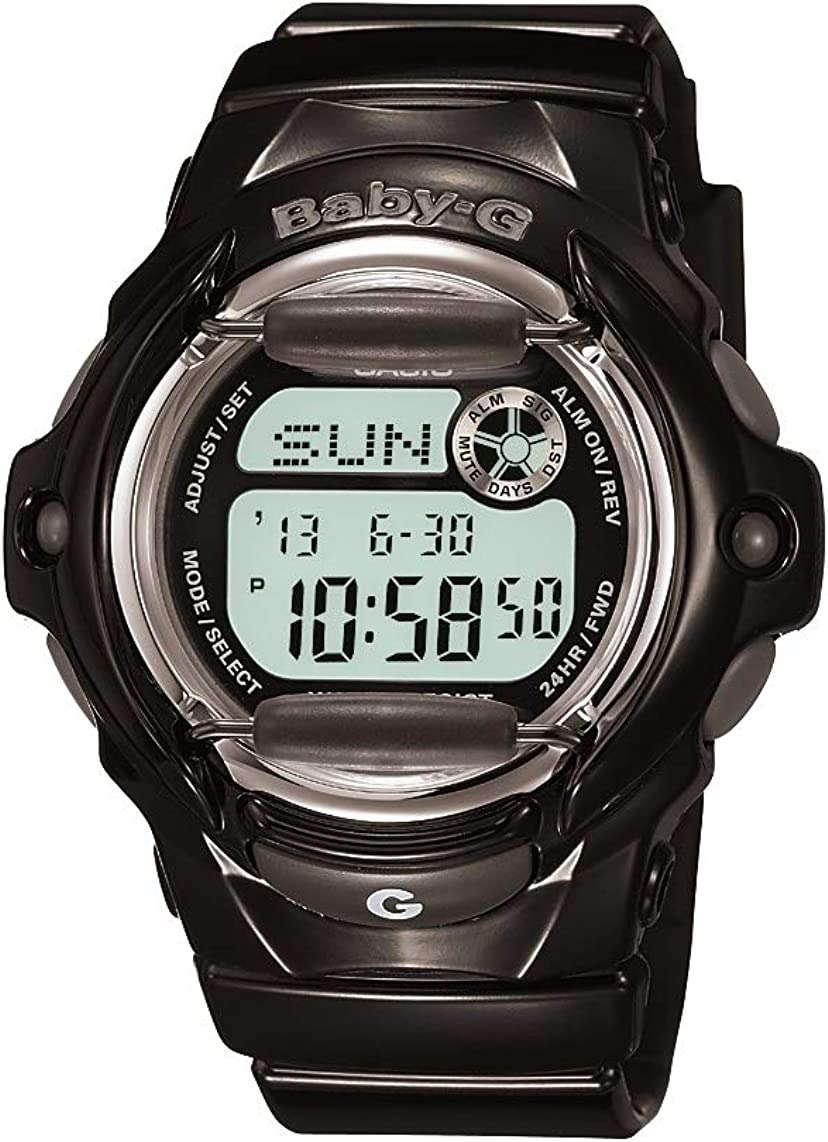 The face of this 200-meter water-resistant Baby-G model features eye-catching vivid color. A metal ring combines with a face protector to create a face that is dynamic, yet classic Baby-G. The wire face protectors on the case allow for worry-free wear at the beach, pool, or in other high-activity areas. Features include day counter, world time, tele-memo, and other functions that come in handy throughout the day.