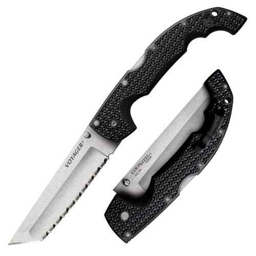 The Cold Steel Voyager series is designed to be the true everyman knife. Lightweight, comfortable, and super sharp, they are rugged, dependable and perfect for hunting and camping as well as general utility and daily cutting chores. Voyagers excel in many survival and rescue applications, and they have proven to be very popular with Police and Military personnel, who appreciate the combination of the cutting performance and safety that they offer. Each knife in our extensive Voyager series is precision engineered and held to our most exacting standards. The Voyager series features Japanese AUS10A Alloy Blades, and our Tri-Ad locking mechanism - which is quite possibly the most secure, safe and shock resistant lock on the market today! The Voyager's ergonomic Griv-Ex handles (reinforced with heat treated 6061 aluminum liners) provide both great comfort and a secure grip even under extended use in tough conditions. Available in two sizes and with numerous blade and edge configurations, there's a Voyager for everyone.