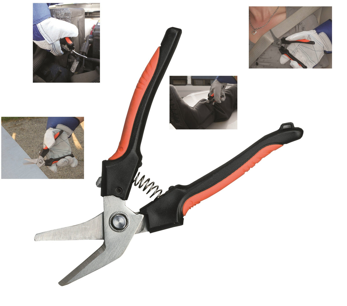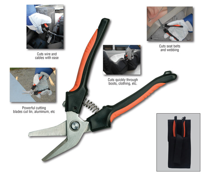 Shear Power is the most powerful and sharpest shears in the industry. It has an angled hardened stainless steel blade with a comfortable spring load non-slip rubber handle. The spring action in the shears increases torque without straining your hands. It can easily cut though wire, cable, leather, webbing, etc. Shear Power has thumboperated lock to ensure that the blades are not exposed, and that the handles lock for safety when stored or when not in use.