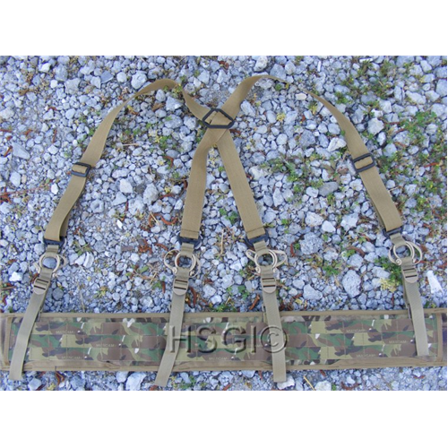 HSGI Suspenders are constructed of 1.5 webbing with elastic shock-cord loops to minimize shock and stress created when reaching overhead or other activities. The connecting points to the belt allow for use over Rigger's belts or around entire padded belts. Tails can be cut or stowed. Hook material is sewn on the tail to grab the belt and act as a keeper. A non-slip suspender divider is used on the back side to prevent shoulder straps from falling off shoulders.