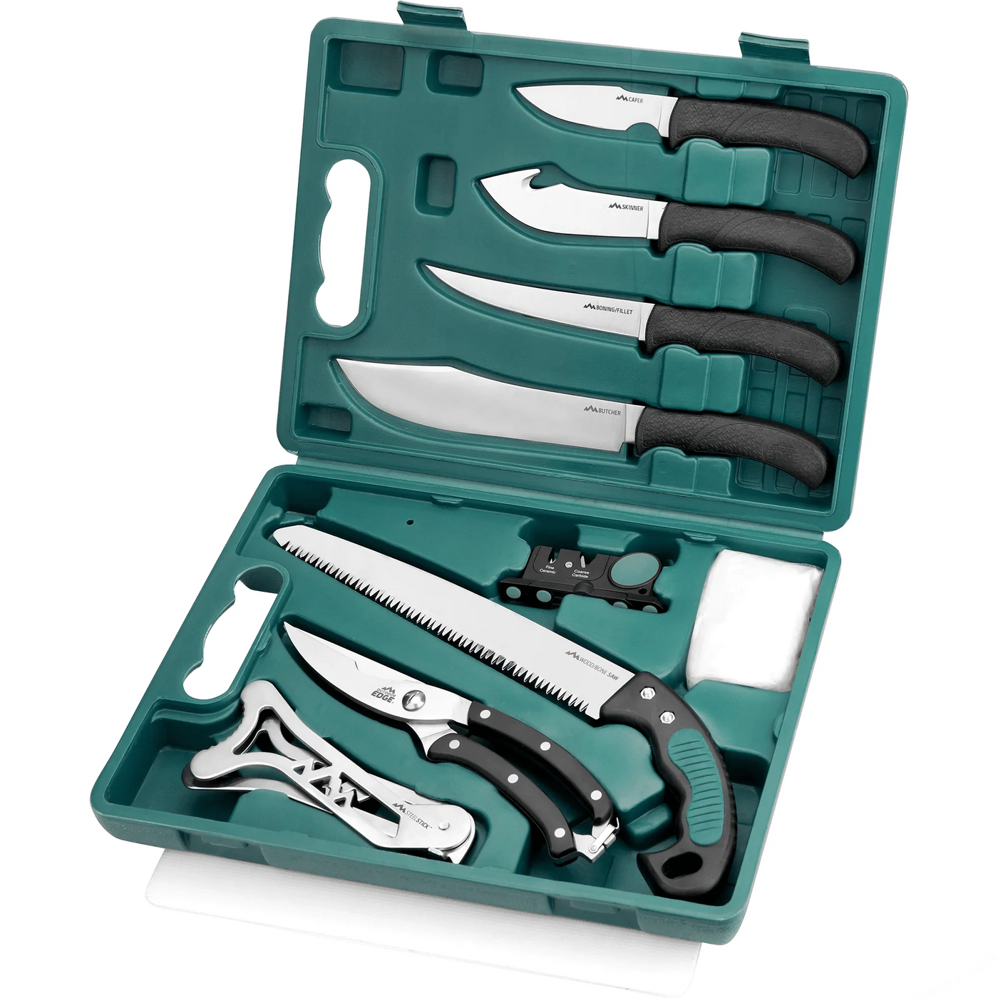 The GamePro is a streamlined version of the time tested GameProcessor. This complete 11-piece game processing kits includes all the tools you need to process like a pro. The GamePro comes complete with a caping knife, gut-hook skinning knife, boning/fillet knife, butcher knife, game shears, wood/bone saw, ribcage spreader, two stage sharpener, game cleaning gloves and a cutting mat, all of which store safely in a hard sided carrying case.