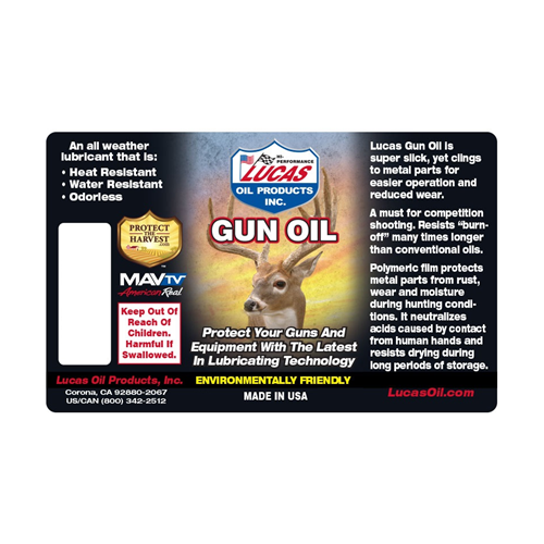 Used and recommended by major firearms manufacturers, Lucas Oil Hunting Gun Oil is an all-weather, environmentally friendly lubricant. Great for general lubrication on all sporting arms such as pump, over/under, and side-by-side shotguns, bolt and lever action rifles, and revolvers. This oil is odorless which makes it ideal for use on hunting firearms. Prevents jamming and overheating, resists evaporation and penetrates rust (freeing stuck parts and actions). Polymeric film protects from rust, wear, and moisture and makes copper, lead, and wad fouling much easier to clean. It neutralizes acids from fingerprints and resists drying for long-term storage use.