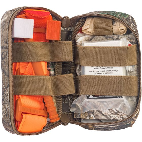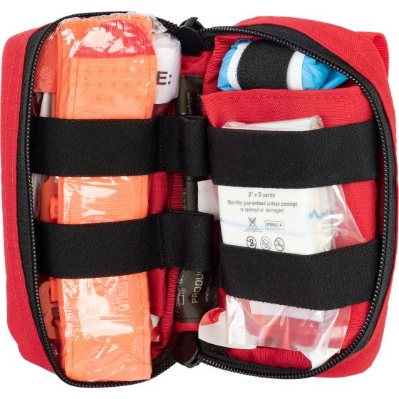 The M-FAK (Mini First Aid Kit) was designed to be the most compact, multi-use IFAK for delivering immediate critical care for penetrating, blast, or other traumatic injuries. The M-FAK is currently the smallest platform available in our product offering. Despite its reduced size, this kit comes fully loaded with the critical medical equipment most requested by First Responders operating in the line of duty. The super compact, 500 Denier nylon bag opens from the side in a clam shell configuration utilizing two main sleeves that open on both ends for easy access and features multiple elastic loops for secure gear organization. The exterior includes a MOLLE backing for mounting in the standard vertical position as well as a 3 inch internal sleeve for accommodating horizontal attachment to your duty belt. The vertical mount can be set to open left-to-right or right-to-left based on shooter preference, while the horizontal mount on a belt allows opening directly to your CAT tourniquet. Also included are a loop patch on front of the bag for custom user labeling and three MOLLE strips to attach additional gear if needed.