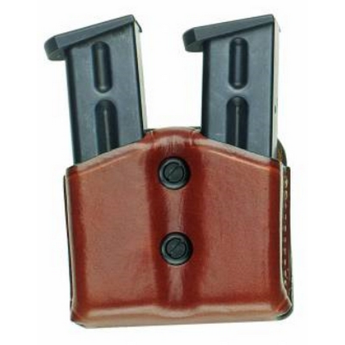 This dual magazine carrier uses two adjustable retention screws for security, and has two snap-fastening belt loops to allow positioning over a pants belt loop.