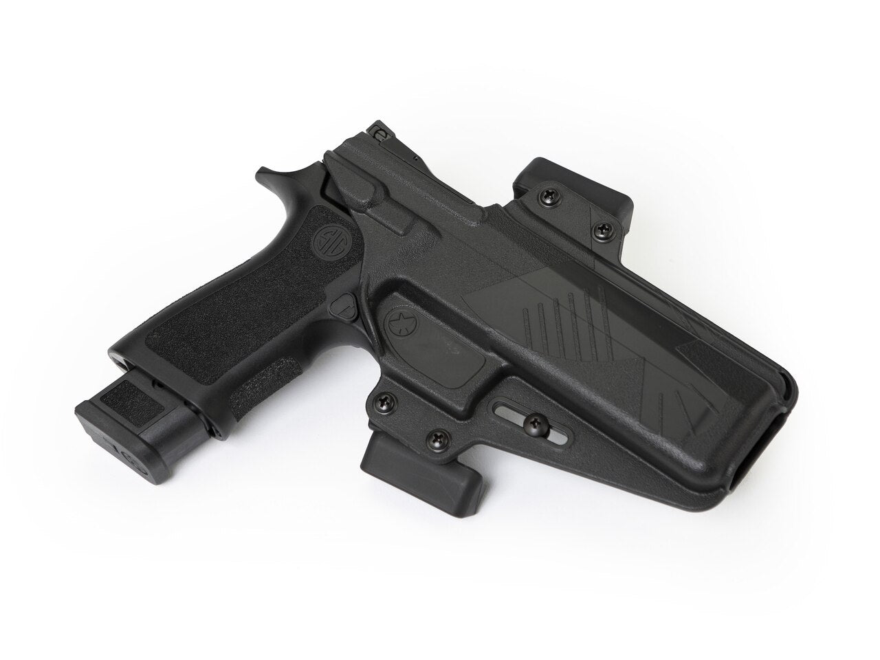 The Perun is the flagship outside-the-waistband (OWB) holster. It is the result of blending the best features of two of the most popular holsters, the Eidolon and the Phantom, to create a highly refined, exceptionally concealable holster. The Perun is designed to be the best modular OWB ''pancake'' style holster on the market. It has a body-hugging design that rides high for maximum concealment. The body of the holster is only slightly larger than the pistol contained in it. This small size aids in concealment while also making the holster more comfortable while seated in a vehicle. The body-hugging curvature of this holster is accomplished using modular belt loops. Each holster includes three pair of 1.5'' belt loops (LH 10 degree cant, RH 10 degree cant, and ambi 0 degree cant), which allow the end-user to configure the ambidextrous holster body for left-handed or right-handed use, with either a 0-degree or 10-degree cant. Retention in the Perun is crisp, defined, and consistent, thanks to innovative design features inside the holster body. The unique retention slider makes adjusting retention as simple as turning up the volume on your stereo. And unlike other holsters that use the traditional ''screw through a rubber grommet'' style of retention, the Perun's retention will not back off after repeated drawing and re-holstering.