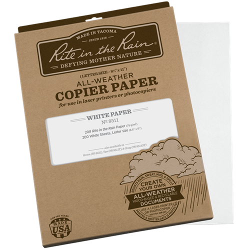 Copy or laser print your own all-weather forms, charts, maps, and worksheets on patented 11'' x 17'' Rite in the Rain All-Weather Copier Paper. Now you can have the convenience of using your existing data sheets on a paper that can survive in any weather condition. For just pennies a sheet, Rite in the Rain enables you to work efficiently, regardless of the environment. Paper is 20# bond weight. Completely recyclable wood-based paper! Copy or laser print both sides!. Not for ink-jet printers.