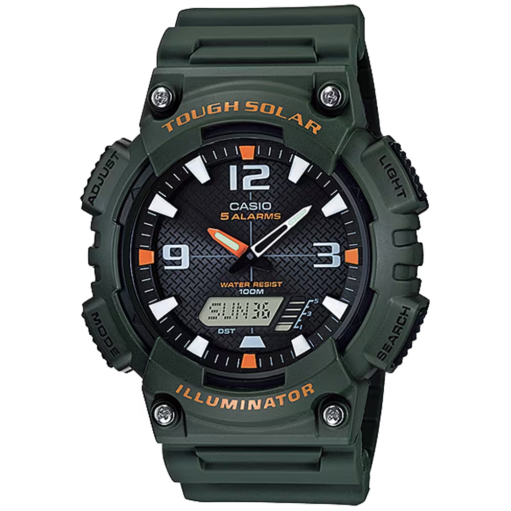 This tough solar powered watch features world time, water-resistance to 100 meters, neo-bright luminous hands and markers, stopwatch, 5 daily alarms, and a dual countdown timer. A solar panel combined with a large-capacity rechargeable battery enables these impressive solar timepieces to run smoothly under any light, with no worry about the battery running down.