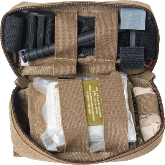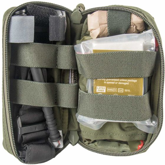 The M-FAK (Mini First Aid Kit) was designed to be the most compact, multi-use IFAK for delivering immediate critical care for penetrating, blast, or other traumatic injuries. The M-FAK is currently the smallest platform available in our product offering. Despite its reduced size, this kit comes fully loaded with the critical medical equipment most requested by First Responders operating in the line of duty. The super compact, 500 Denier nylon bag opens from the side in a clam shell configuration utilizing two main sleeves that open on both ends for easy access and features multiple elastic loops for secure gear organization. The exterior includes a MOLLE backing for mounting in the standard vertical position as well as a 3 inch internal sleeve for accommodating horizontal attachment to your duty belt. The vertical mount can be set to open left-to-right or right-to-left based on shooter preference, while the horizontal mount on a belt allows opening directly to your CAT tourniquet. Also included are a loop patch on front of the bag for custom user labeling and three MOLLE strips to attach additional gear if needed.