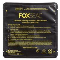Designed for simple, consistent performance for the treatment of open chest wounds. Works on wet or hairy skin and comes in a compact size that fits your medical kit. There are two seals per pack that allow entry and exit wounds to be treated with the valve-free design. Foxseal provides strong adhesion in extreme conditions and come two per pack for ballistic wounds. Pack has four tear notches for opening.