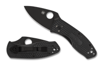 The smallest member of Spyderco’s popular Value Folder series, the Ambitious is an ultra-compact cutting tool that cuts with big-knife authority. In its lightweight configuration, it trades the G-10 scales of the original for injection-molded fiberglass-reinforced nylon (FRN) with a high-traction Bi-Directional Texture pattern. Taking that evolution one step further, the Ambitious Lightweight Black Blade cloaks the knife’s full-flat-ground 8Cr13MoV stainless steel blade in a non-reflective black oxide coating. Consistent with that theme, the handle’s full skeletonized stainless steel liners, four-position pocket clip, and other hardware also sport stealthy black coatings. Available in a choice of either PlainEdge or fully serrated SpyderEdge, both configurations feature a sturdy LinerLock mechanism to lock the blade securely open during use.