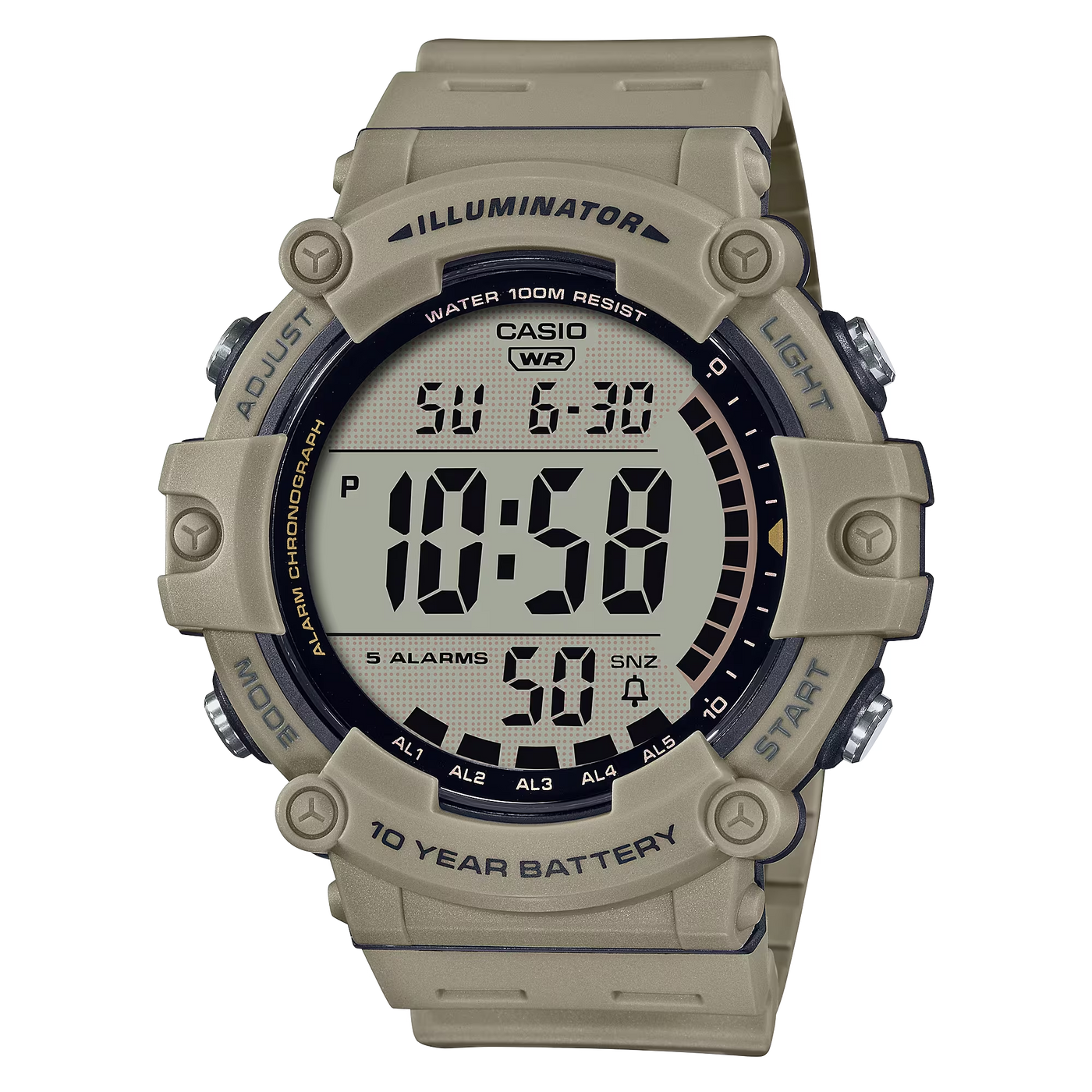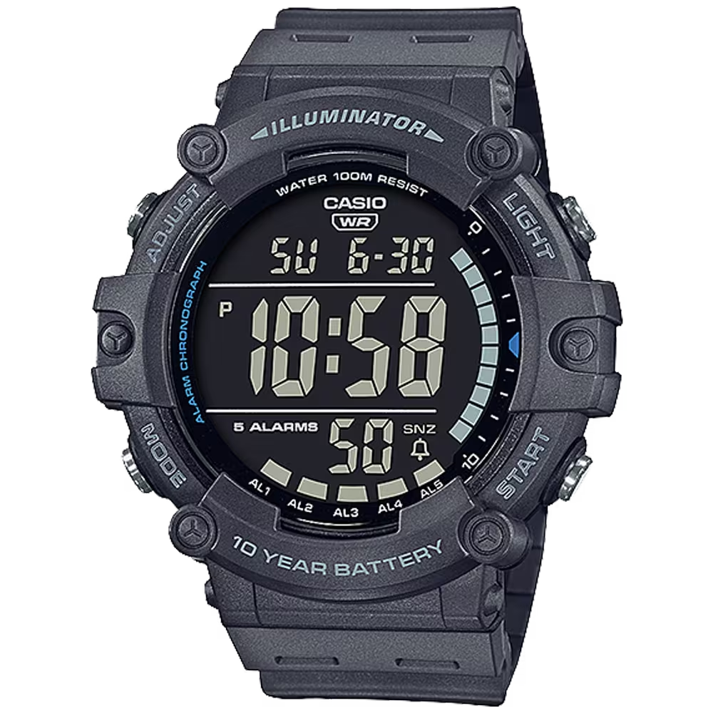 The Classic Digital Watch with 10-Year Battery features a large, easy-to-read case design, water-resistance to 100 meters, LED backlight with afterglow, stopwatch, countdown timer, 5 alarms, hourly time signal, and 10-year batter life.