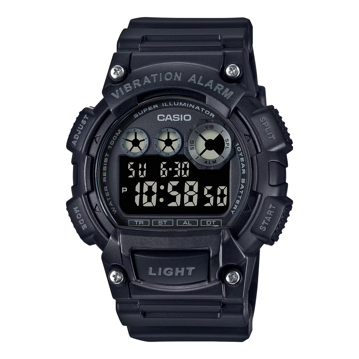 This classic sport watch features a vibrating alarm, water-resistance to 100 meters, stopwatch, countdown timer, super illuminator backlight, dual time, and a 10-year battery life.